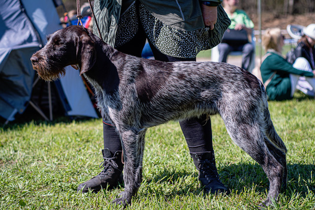 Exterior | Color | Nose | Coat Length | Coat Quality | Coat Curl | Belly Coverage | Furnishings | Skeleton | Bite | Dentition | Eye Color | Height | Length | Gun Reactivity | Character | Temperament Notes | Description | Other Notes | Field Notes | Exterior Notes |