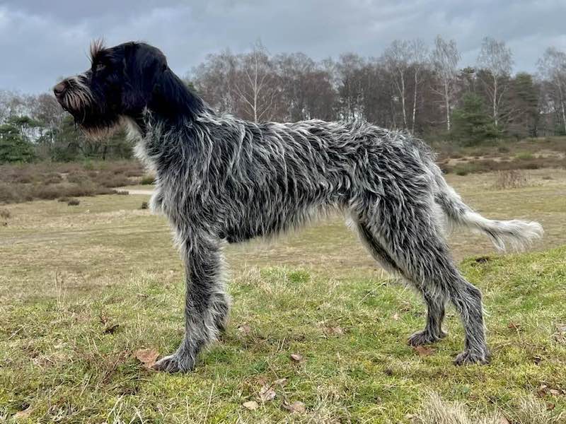 Exterior | Color | Nose | Coat Length | Coat Quality | Coat Curl | Belly Coverage | Furnishings | Skeleton | Bite | Dentition | Eye Color | Height | Length | Gun Reactivity | Character | Temperament Notes | Description | Other Notes | Field Notes | Exterior Notes |