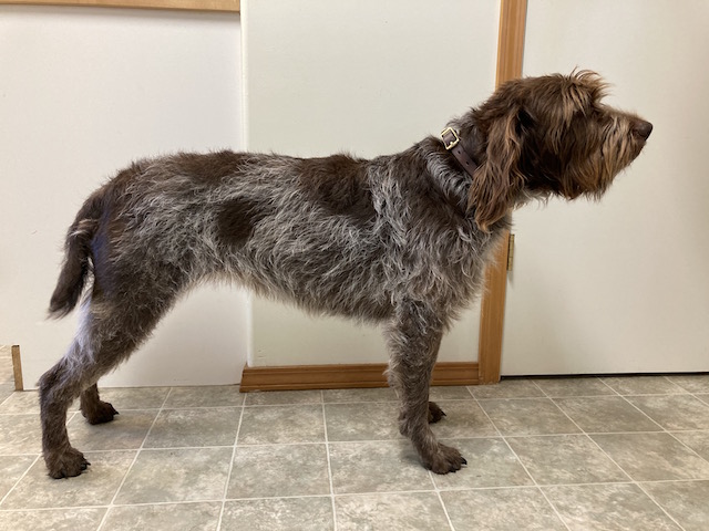 Exterior | Color | Nose | Coat Length | Coat Quality | Coat Curl | Belly Coverage | Furnishings | Skeleton | Bite | Dentition | Eye Color | Height | Length | Gun Reactivity | Character | Temperament Notes | Description | Other Notes | Field Notes | Exterior Notes |